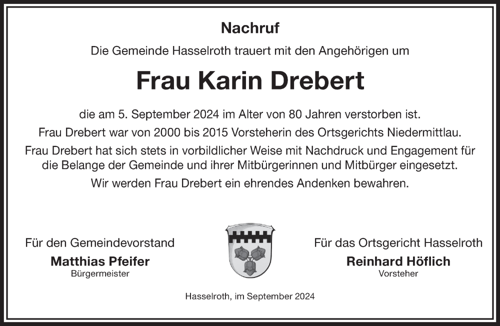 Hier finden Sie alle Traueranzeigen aus der Zeitung, die bisher für Karin Drebert erschienen sind. Weitere Traueranzeigen, die in der Zeitung erscheinen, werden hier ebenfalls aufgelistet