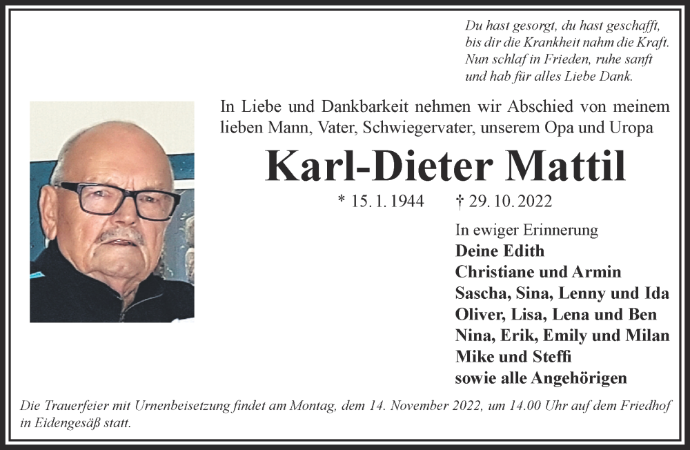 Hier finden Sie alle Traueranzeigen aus der Zeitung, die bisher für Karl-Dieter Mattil erschienen sind. Weitere Traueranzeigen, die in der Zeitung erscheinen, werden hier ebenfalls aufgelistet