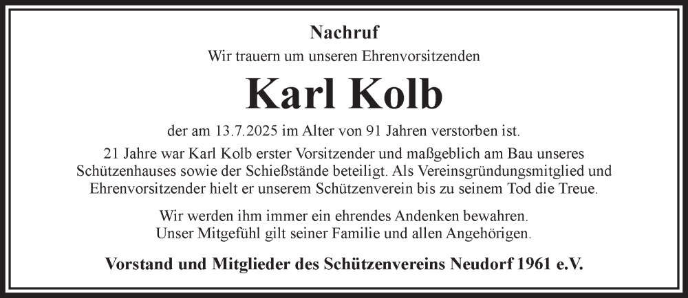 Hier finden Sie alle Traueranzeigen aus der Zeitung, die bisher für Karl Kolb erschienen sind. Weitere Traueranzeigen, die in der Zeitung erscheinen, werden hier ebenfalls aufgelistet