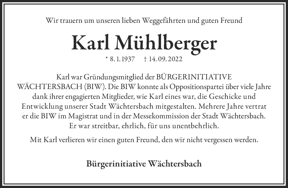 Hier finden Sie alle Traueranzeigen aus der Zeitung, die bisher für Karl Mühlberger erschienen sind. Weitere Traueranzeigen, die in der Zeitung erscheinen, werden hier ebenfalls aufgelistet