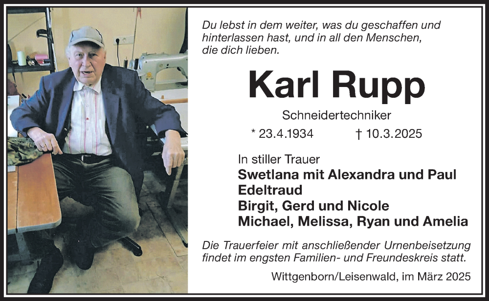 Hier finden Sie alle Traueranzeigen aus der Zeitung, die bisher für Karl Rupp erschienen sind. Weitere Traueranzeigen, die in der Zeitung erscheinen, werden hier ebenfalls aufgelistet