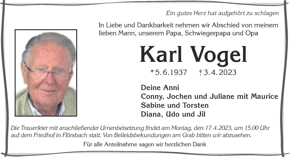 Hier finden Sie alle Traueranzeigen aus der Zeitung, die bisher für Karl Vogel erschienen sind. Weitere Traueranzeigen, die in der Zeitung erscheinen, werden hier ebenfalls aufgelistet