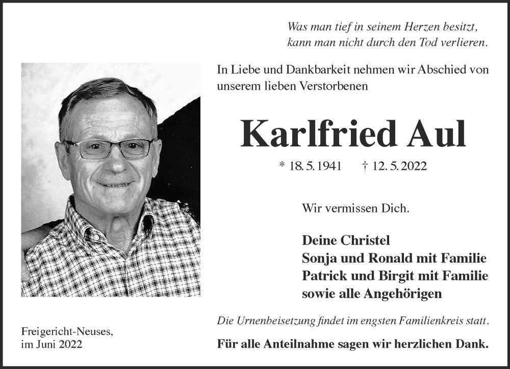 Hier finden Sie alle Traueranzeigen aus der Zeitung, die bisher für Karlfried Aul erschienen sind. Weitere Traueranzeigen, die in der Zeitung erscheinen, werden hier ebenfalls aufgelistet