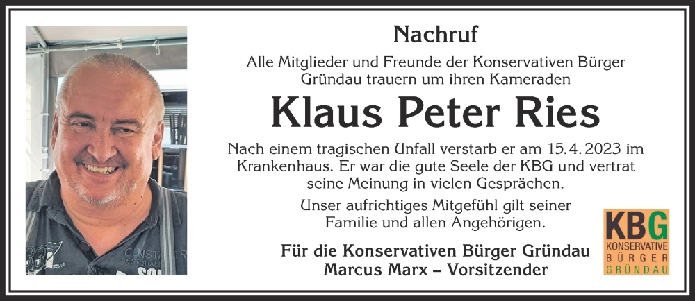 Hier finden Sie alle Traueranzeigen aus der Zeitung, die bisher für Klaus Peter Ries erschienen sind. Weitere Traueranzeigen, die in der Zeitung erscheinen, werden hier ebenfalls aufgelistet