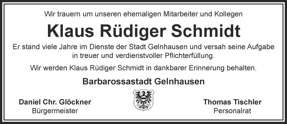 Hier finden Sie alle Traueranzeigen aus der Zeitung, die bisher für Klaus Rüdiger Schmidt erschienen sind. Weitere Traueranzeigen, die in der Zeitung erscheinen, werden hier ebenfalls aufgelistet