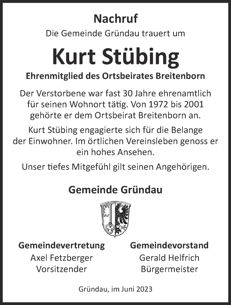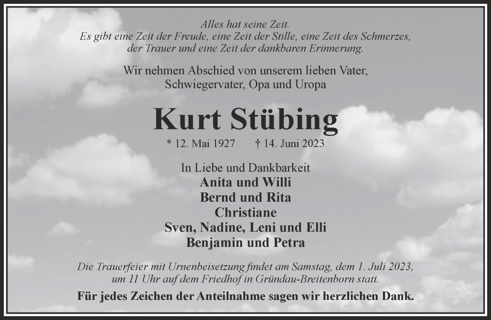 Hier finden Sie alle Traueranzeigen aus der Zeitung, die bisher für Kurt Stübing erschienen sind. Weitere Traueranzeigen, die in der Zeitung erscheinen, werden hier ebenfalls aufgelistet