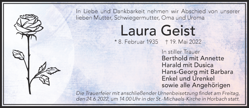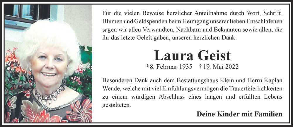 Hier finden Sie alle Traueranzeigen aus der Zeitung, die bisher für Laura Geist erschienen sind. Weitere Traueranzeigen, die in der Zeitung erscheinen, werden hier ebenfalls aufgelistet