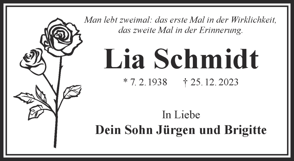 Hier finden Sie alle Traueranzeigen aus der Zeitung, die bisher für Lia Schmidt erschienen sind. Weitere Traueranzeigen, die in der Zeitung erscheinen, werden hier ebenfalls aufgelistet