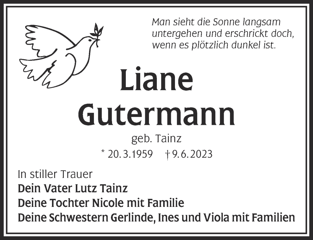 Hier finden Sie alle Traueranzeigen aus der Zeitung, die bisher für Liane Gutermann erschienen sind. Weitere Traueranzeigen, die in der Zeitung erscheinen, werden hier ebenfalls aufgelistet