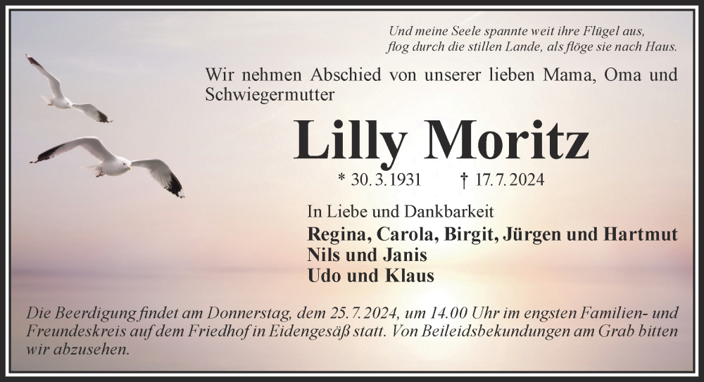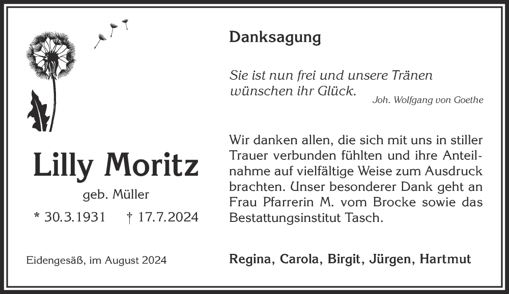 Hier finden Sie alle Traueranzeigen aus der Zeitung, die bisher für Lilly Moritz erschienen sind. Weitere Traueranzeigen, die in der Zeitung erscheinen, werden hier ebenfalls aufgelistet