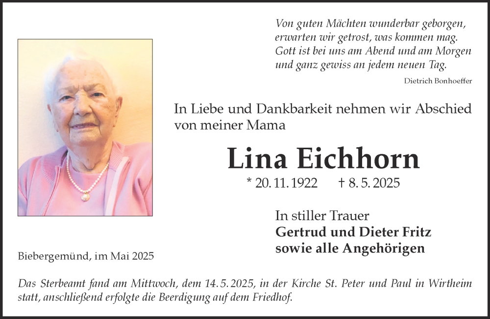 Hier finden Sie alle Traueranzeigen aus der Zeitung, die bisher für Lina Eichhorn erschienen sind. Weitere Traueranzeigen, die in der Zeitung erscheinen, werden hier ebenfalls aufgelistet