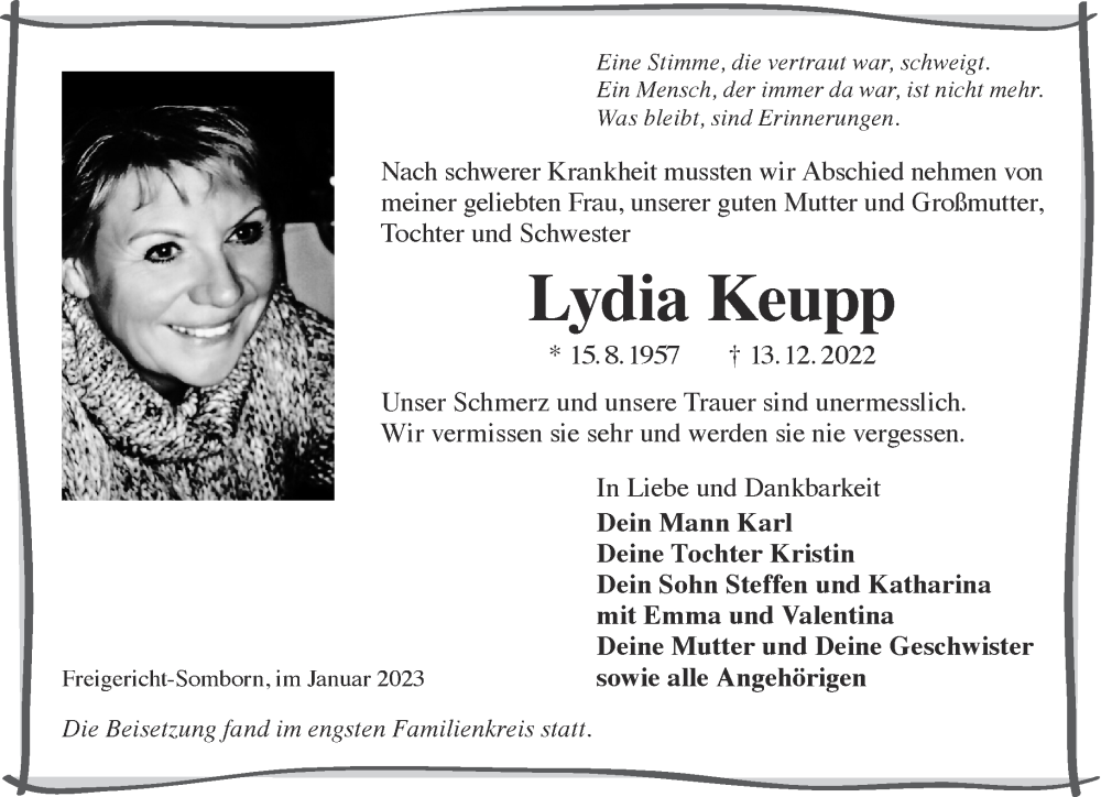 Hier finden Sie alle Traueranzeigen aus der Zeitung, die bisher für Lydia Keupp erschienen sind. Weitere Traueranzeigen, die in der Zeitung erscheinen, werden hier ebenfalls aufgelistet