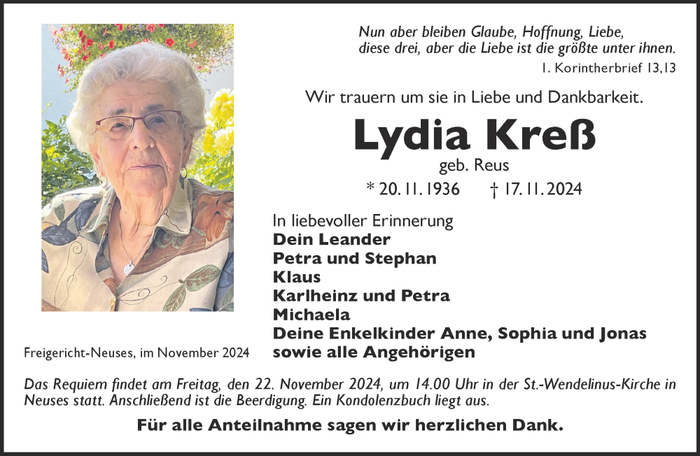 Hier finden Sie alle Traueranzeigen aus der Zeitung, die bisher für Lydia Kreß erschienen sind. Weitere Traueranzeigen, die in der Zeitung erscheinen, werden hier ebenfalls aufgelistet