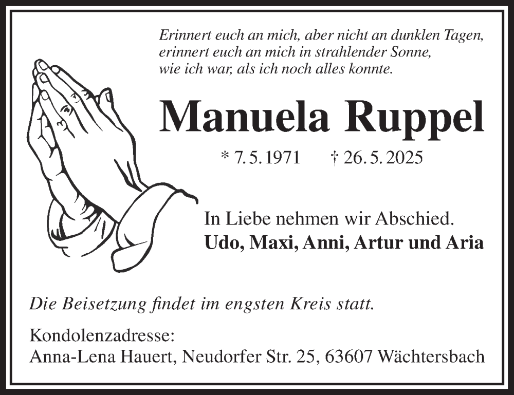 Hier finden Sie alle Traueranzeigen aus der Zeitung, die bisher für Manuela Ruppel erschienen sind. Weitere Traueranzeigen, die in der Zeitung erscheinen, werden hier ebenfalls aufgelistet