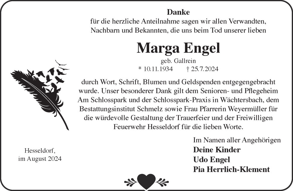 Hier finden Sie alle Traueranzeigen aus der Zeitung, die bisher für Marga Engel erschienen sind. Weitere Traueranzeigen, die in der Zeitung erscheinen, werden hier ebenfalls aufgelistet