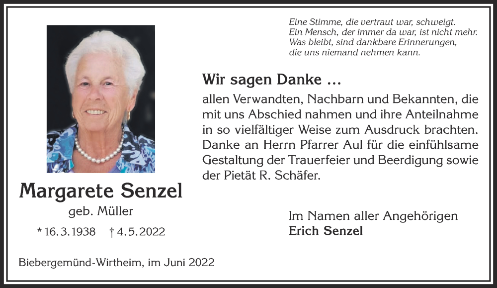 Hier finden Sie alle Traueranzeigen aus der Zeitung, die bisher für Margarete Senzel erschienen sind. Weitere Traueranzeigen, die in der Zeitung erscheinen, werden hier ebenfalls aufgelistet