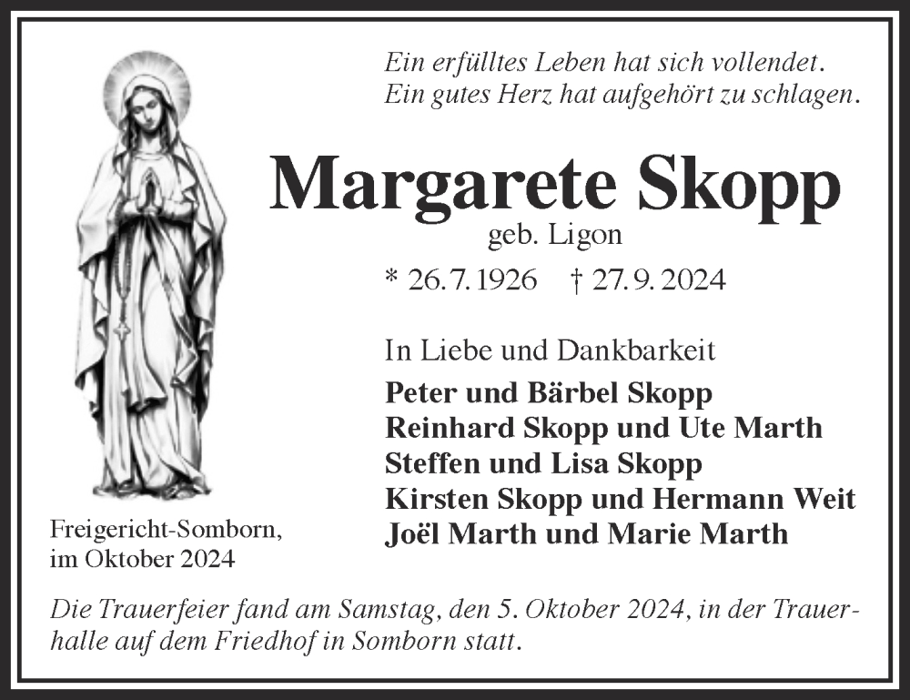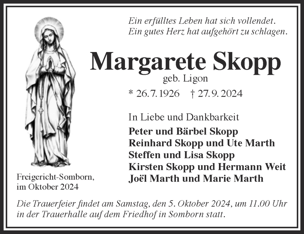 Hier finden Sie alle Traueranzeigen aus der Zeitung, die bisher für Margarete Skopp erschienen sind. Weitere Traueranzeigen, die in der Zeitung erscheinen, werden hier ebenfalls aufgelistet