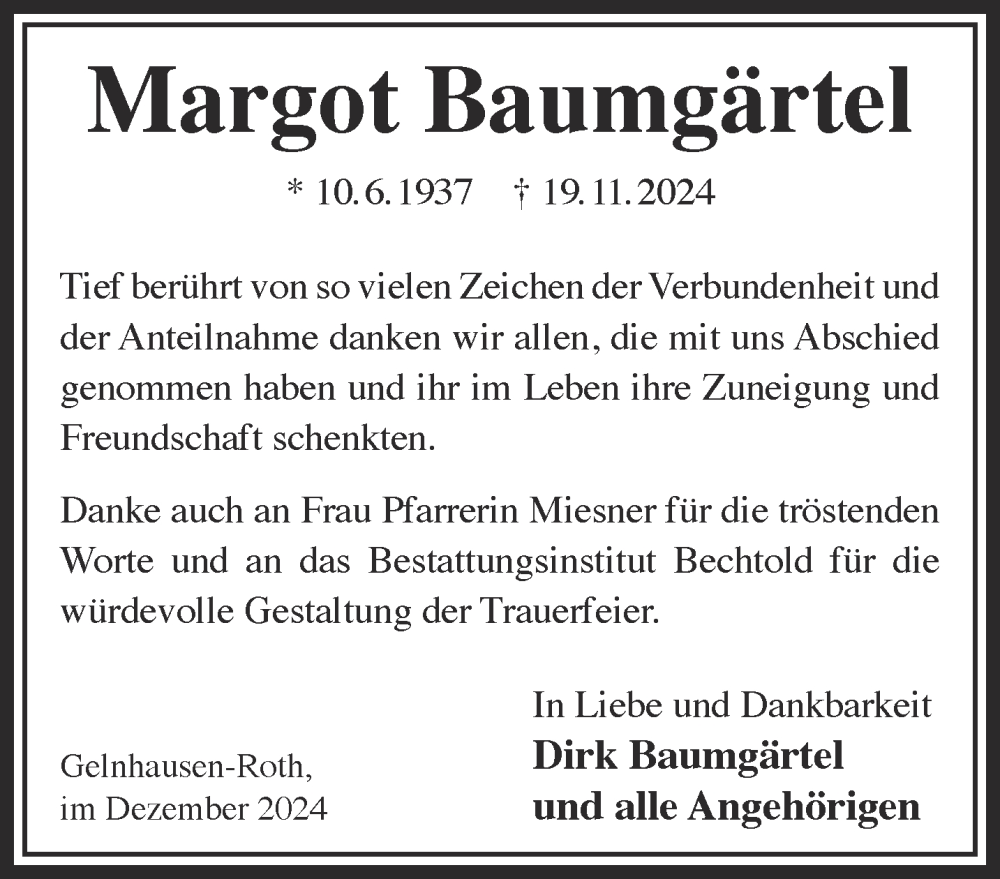 Hier finden Sie alle Traueranzeigen aus der Zeitung, die bisher für Margot Baumgärtel erschienen sind. Weitere Traueranzeigen, die in der Zeitung erscheinen, werden hier ebenfalls aufgelistet