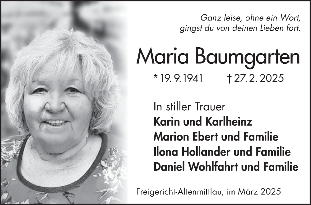 Hier finden Sie alle Traueranzeigen aus der Zeitung, die bisher für Maria Baumgarten erschienen sind. Weitere Traueranzeigen, die in der Zeitung erscheinen, werden hier ebenfalls aufgelistet