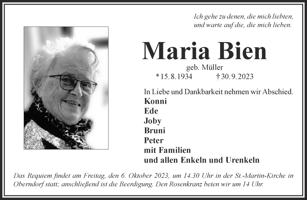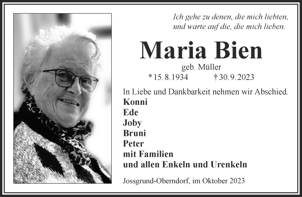 Hier finden Sie alle Traueranzeigen aus der Zeitung, die bisher für Maria Bien erschienen sind. Weitere Traueranzeigen, die in der Zeitung erscheinen, werden hier ebenfalls aufgelistet