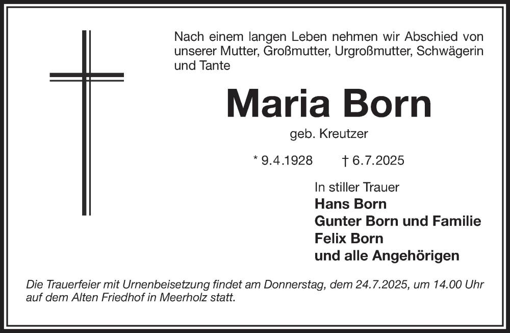 Hier finden Sie alle Traueranzeigen aus der Zeitung, die bisher für Maria Born erschienen sind. Weitere Traueranzeigen, die in der Zeitung erscheinen, werden hier ebenfalls aufgelistet