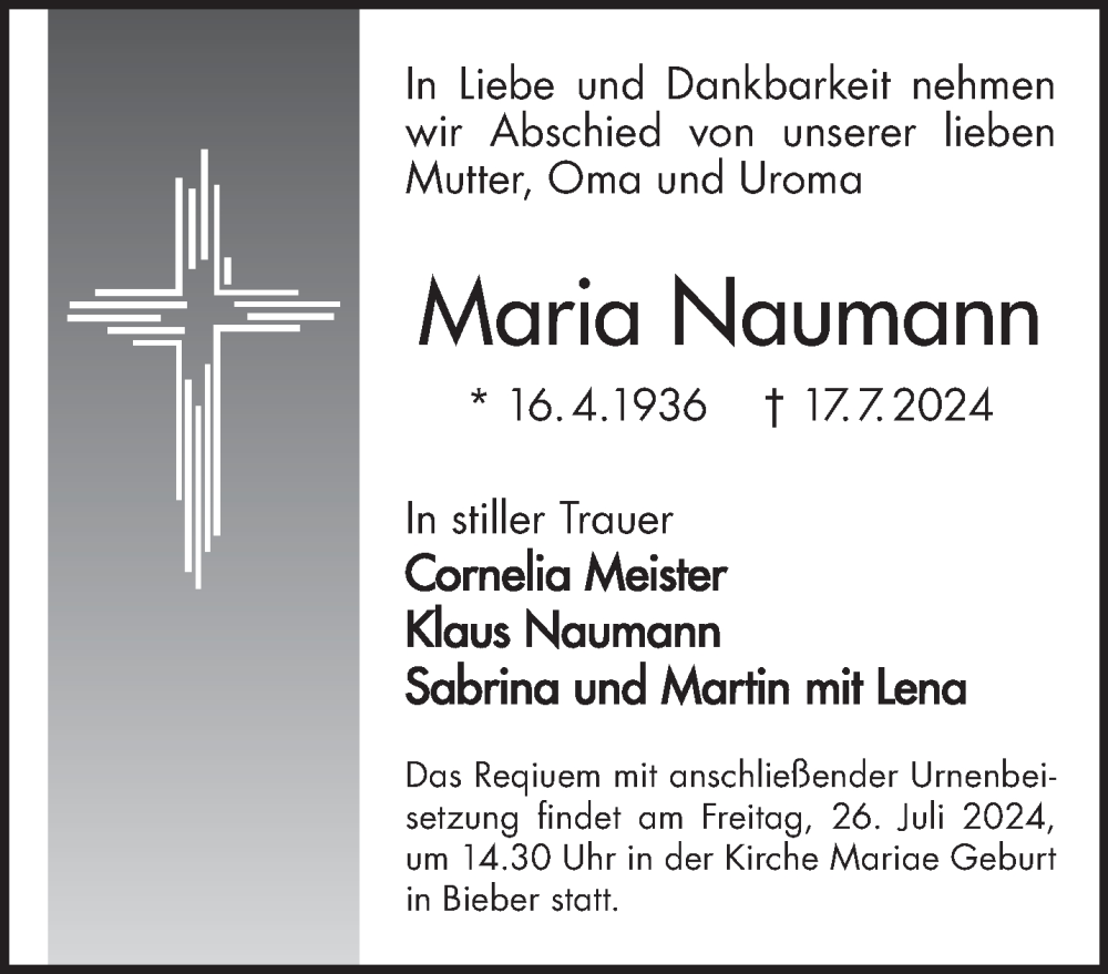 Hier finden Sie alle Traueranzeigen aus der Zeitung, die bisher für Maria Naumann erschienen sind. Weitere Traueranzeigen, die in der Zeitung erscheinen, werden hier ebenfalls aufgelistet