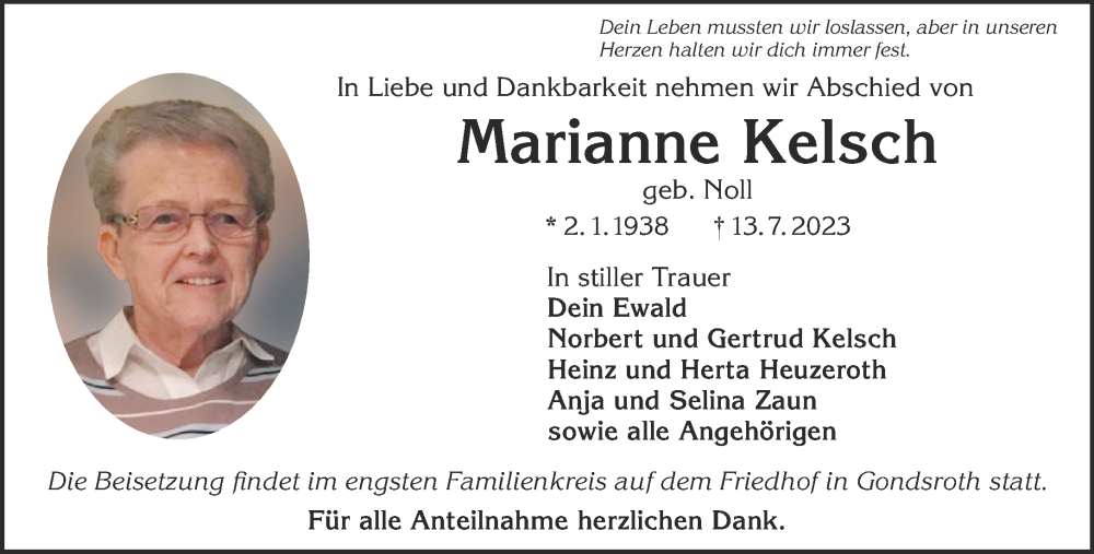 Hier finden Sie alle Traueranzeigen aus der Zeitung, die bisher für Marianne Kelsch erschienen sind. Weitere Traueranzeigen, die in der Zeitung erscheinen, werden hier ebenfalls aufgelistet