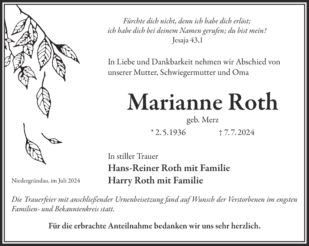 Hier finden Sie alle Traueranzeigen aus der Zeitung, die bisher für Marianne Roth erschienen sind. Weitere Traueranzeigen, die in der Zeitung erscheinen, werden hier ebenfalls aufgelistet