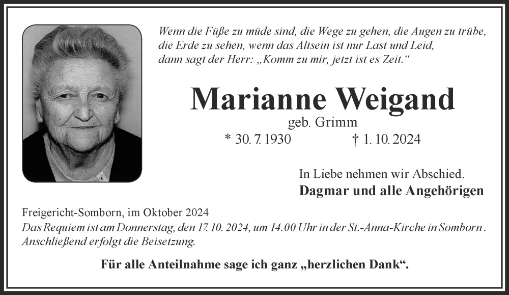 Hier finden Sie alle Traueranzeigen aus der Zeitung, die bisher für Marianne Weigand erschienen sind. Weitere Traueranzeigen, die in der Zeitung erscheinen, werden hier ebenfalls aufgelistet