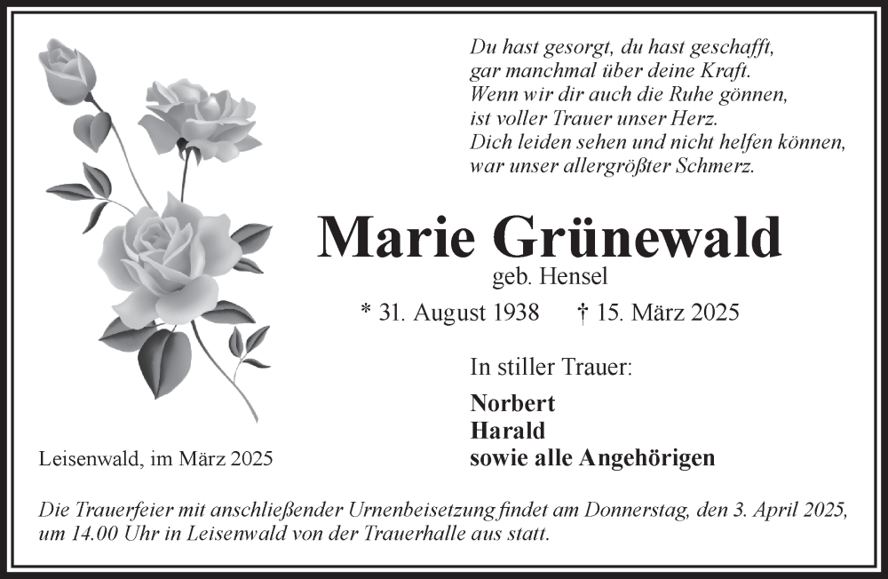 Hier finden Sie alle Traueranzeigen aus der Zeitung, die bisher für Marie Grünewald erschienen sind. Weitere Traueranzeigen, die in der Zeitung erscheinen, werden hier ebenfalls aufgelistet