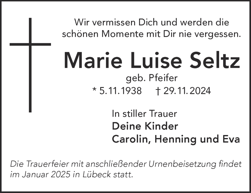 Hier finden Sie alle Traueranzeigen aus der Zeitung, die bisher für Marie Luise Seltz erschienen sind. Weitere Traueranzeigen, die in der Zeitung erscheinen, werden hier ebenfalls aufgelistet