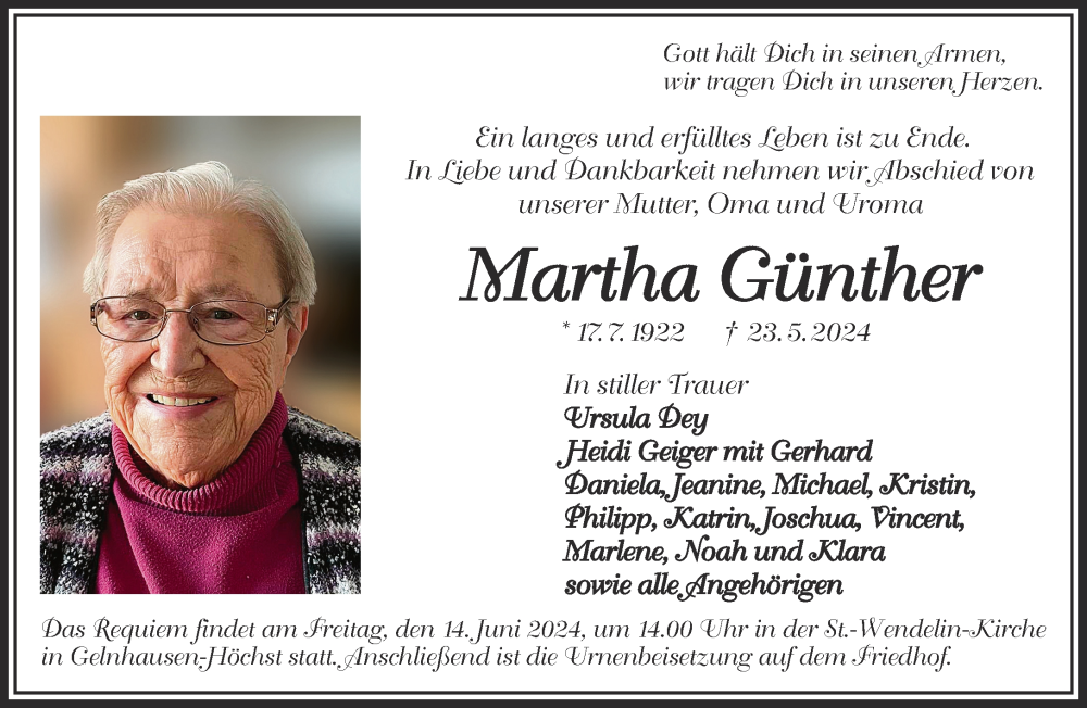 Hier finden Sie alle Traueranzeigen aus der Zeitung, die bisher für Martha Günther erschienen sind. Weitere Traueranzeigen, die in der Zeitung erscheinen, werden hier ebenfalls aufgelistet
