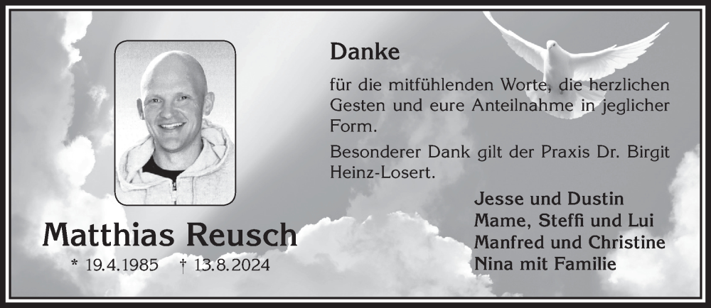 Hier finden Sie alle Traueranzeigen aus der Zeitung, die bisher für Matthias Reusch erschienen sind. Weitere Traueranzeigen, die in der Zeitung erscheinen, werden hier ebenfalls aufgelistet