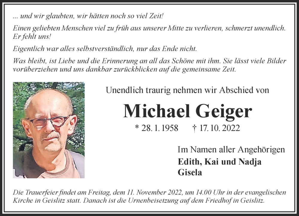 Hier finden Sie alle Traueranzeigen aus der Zeitung, die bisher für Michael Geiger erschienen sind. Weitere Traueranzeigen, die in der Zeitung erscheinen, werden hier ebenfalls aufgelistet