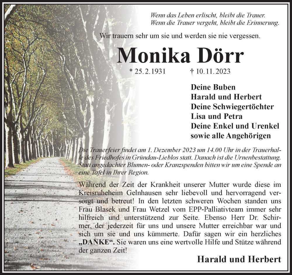 Hier finden Sie alle Traueranzeigen aus der Zeitung, die bisher für Monika Dörr erschienen sind. Weitere Traueranzeigen, die in der Zeitung erscheinen, werden hier ebenfalls aufgelistet