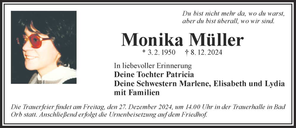 Hier finden Sie alle Traueranzeigen aus der Zeitung, die bisher für Monika Müller erschienen sind. Weitere Traueranzeigen, die in der Zeitung erscheinen, werden hier ebenfalls aufgelistet