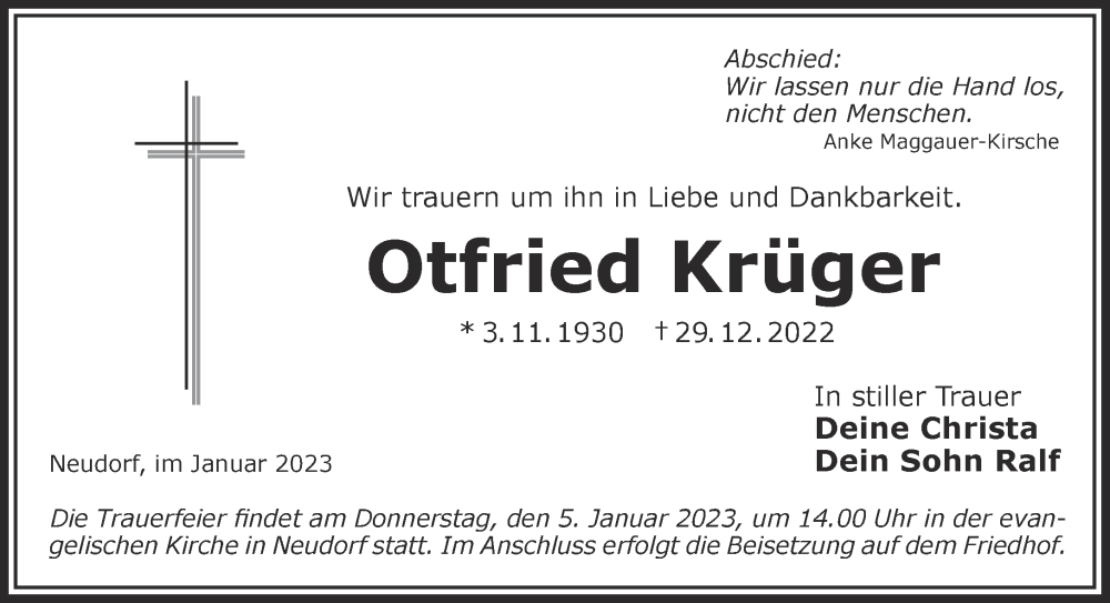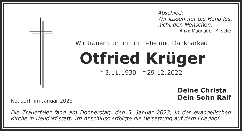 Hier finden Sie alle Traueranzeigen aus der Zeitung, die bisher für Otfried Krüger erschienen sind. Weitere Traueranzeigen, die in der Zeitung erscheinen, werden hier ebenfalls aufgelistet