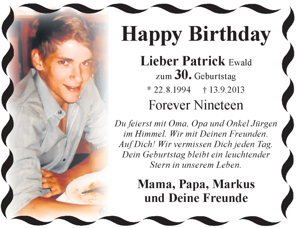Hier finden Sie alle Traueranzeigen aus der Zeitung, die bisher für Patrick Ewald erschienen sind. Weitere Traueranzeigen, die in der Zeitung erscheinen, werden hier ebenfalls aufgelistet