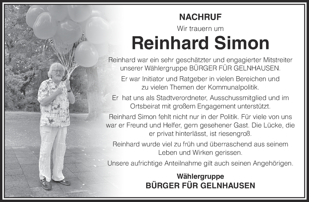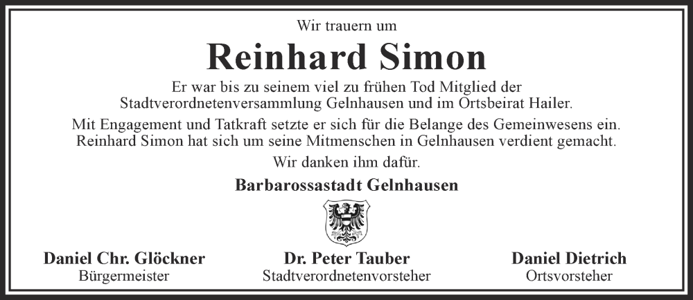 Hier finden Sie alle Traueranzeigen aus der Zeitung, die bisher für Reinhard Simon erschienen sind. Weitere Traueranzeigen, die in der Zeitung erscheinen, werden hier ebenfalls aufgelistet