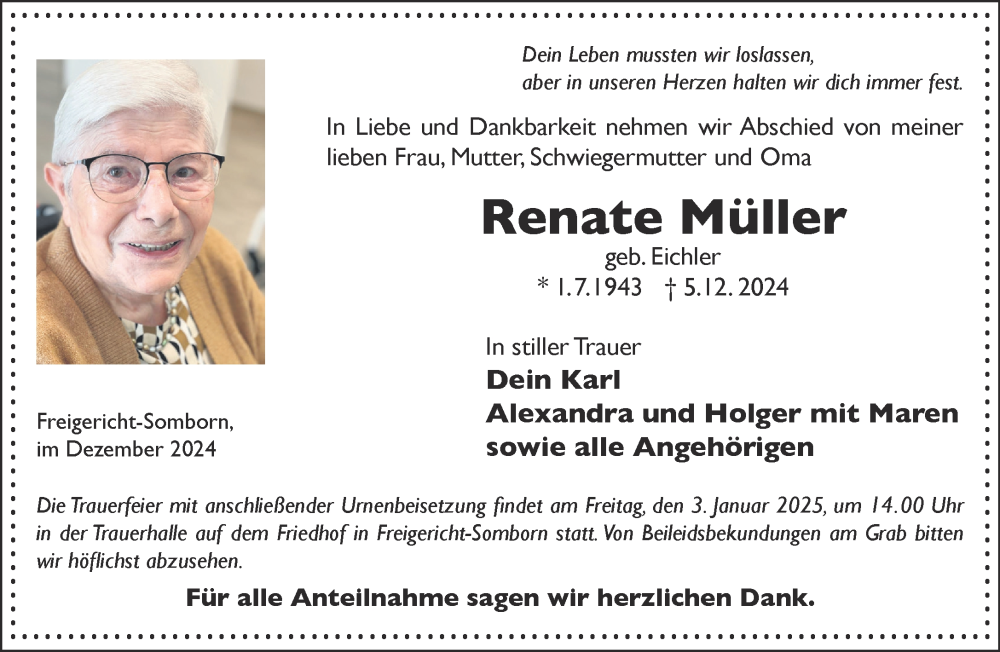 Hier finden Sie alle Traueranzeigen aus der Zeitung, die bisher für Renate Müller erschienen sind. Weitere Traueranzeigen, die in der Zeitung erscheinen, werden hier ebenfalls aufgelistet