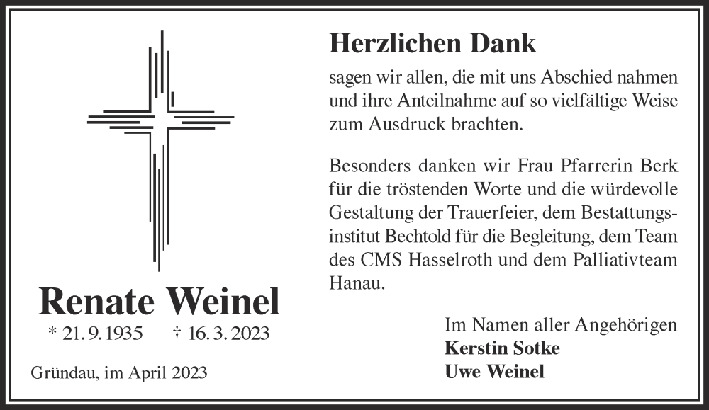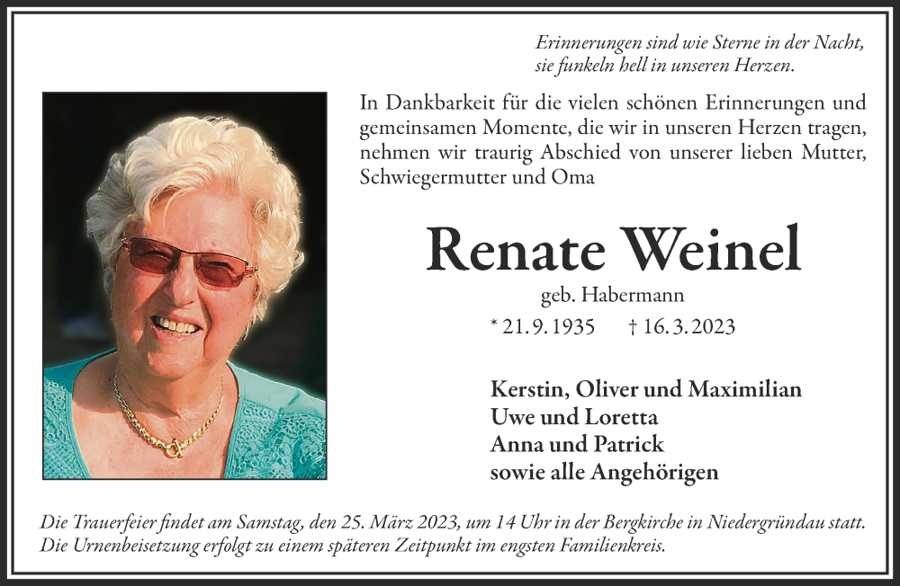 Hier finden Sie alle Traueranzeigen aus der Zeitung, die bisher für Renate Weinel erschienen sind. Weitere Traueranzeigen, die in der Zeitung erscheinen, werden hier ebenfalls aufgelistet