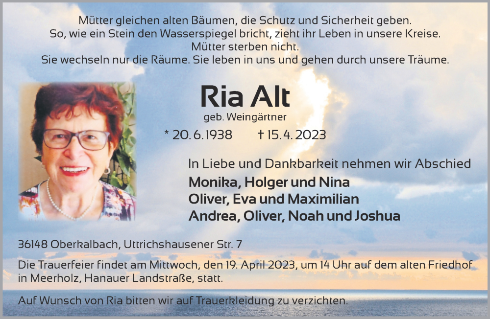 Hier finden Sie alle Traueranzeigen aus der Zeitung, die bisher für Ria Alt erschienen sind. Weitere Traueranzeigen, die in der Zeitung erscheinen, werden hier ebenfalls aufgelistet