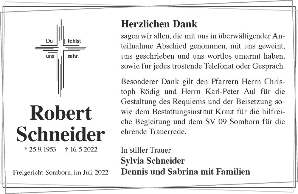 Hier finden Sie alle Traueranzeigen aus der Zeitung, die bisher für Robert Schneider erschienen sind. Weitere Traueranzeigen, die in der Zeitung erscheinen, werden hier ebenfalls aufgelistet