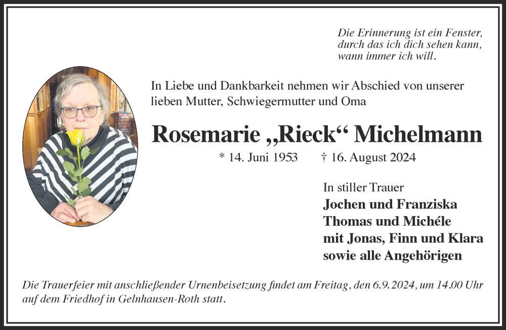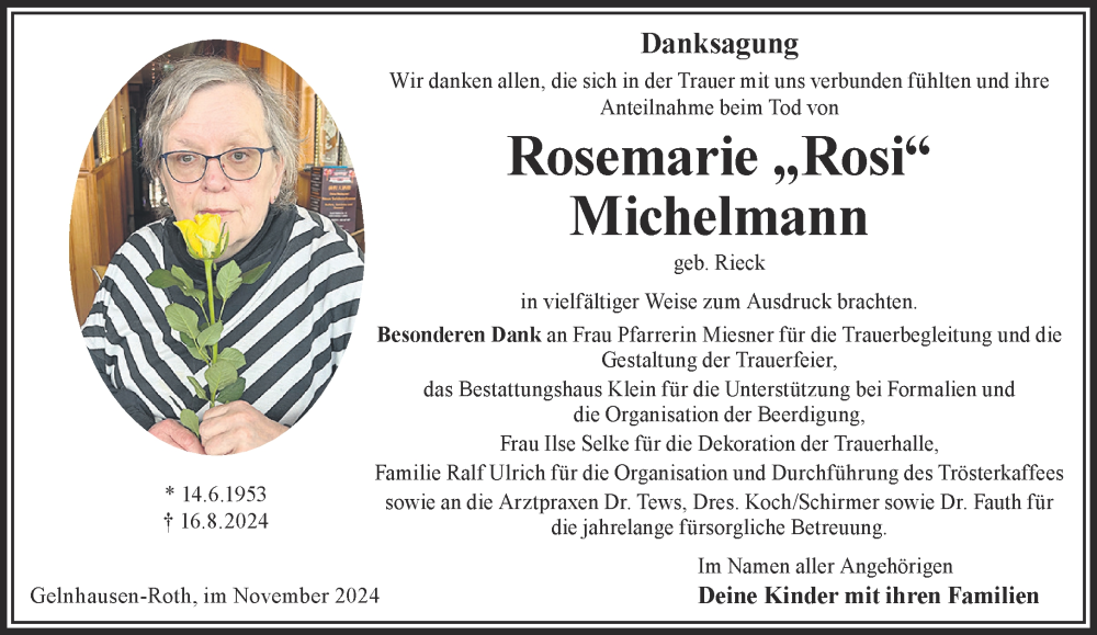Hier finden Sie alle Traueranzeigen aus der Zeitung, die bisher für Rosemarie Michelmann erschienen sind. Weitere Traueranzeigen, die in der Zeitung erscheinen, werden hier ebenfalls aufgelistet