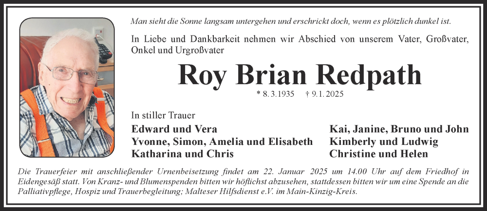 Hier finden Sie alle Traueranzeigen aus der Zeitung, die bisher für Roy Brian Redpath erschienen sind. Weitere Traueranzeigen, die in der Zeitung erscheinen, werden hier ebenfalls aufgelistet