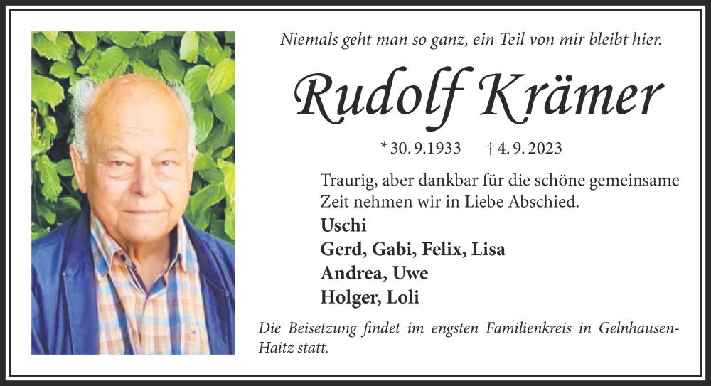 Hier finden Sie alle Traueranzeigen aus der Zeitung, die bisher für Rudolf Krämer erschienen sind. Weitere Traueranzeigen, die in der Zeitung erscheinen, werden hier ebenfalls aufgelistet
