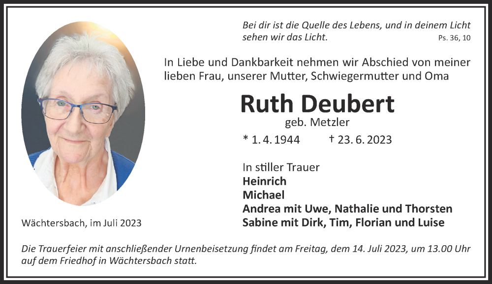 Hier finden Sie alle Traueranzeigen aus der Zeitung, die bisher für Ruth Deubert erschienen sind. Weitere Traueranzeigen, die in der Zeitung erscheinen, werden hier ebenfalls aufgelistet