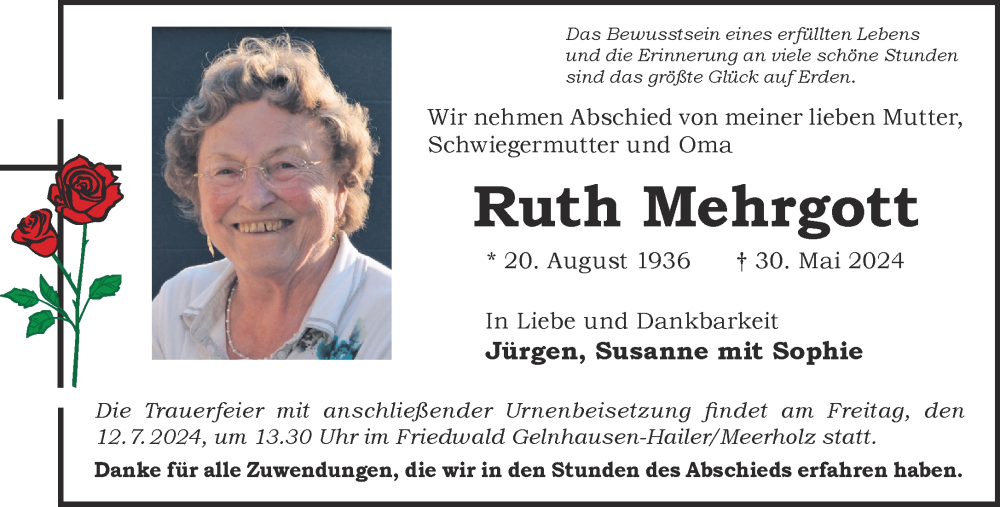 Hier finden Sie alle Traueranzeigen aus der Zeitung, die bisher für Ruth Mehrgott erschienen sind. Weitere Traueranzeigen, die in der Zeitung erscheinen, werden hier ebenfalls aufgelistet