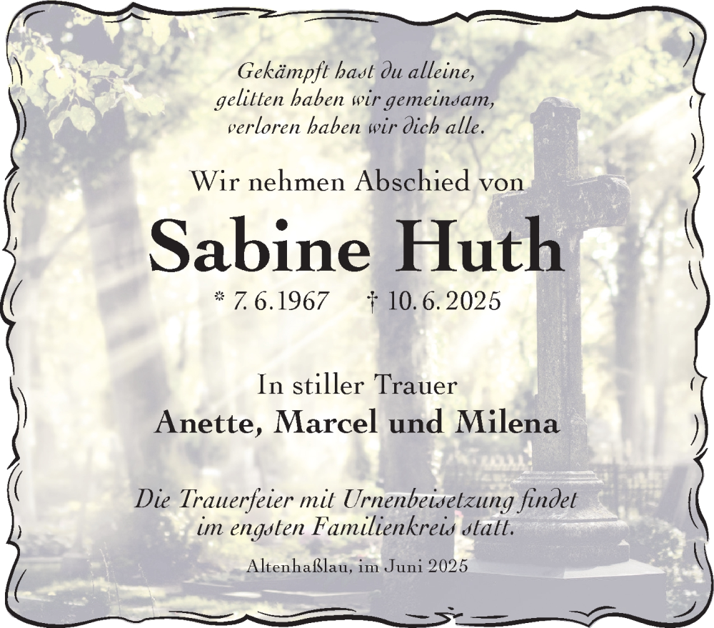 Hier finden Sie alle Traueranzeigen aus der Zeitung, die bisher für Sabine Huth erschienen sind. Weitere Traueranzeigen, die in der Zeitung erscheinen, werden hier ebenfalls aufgelistet