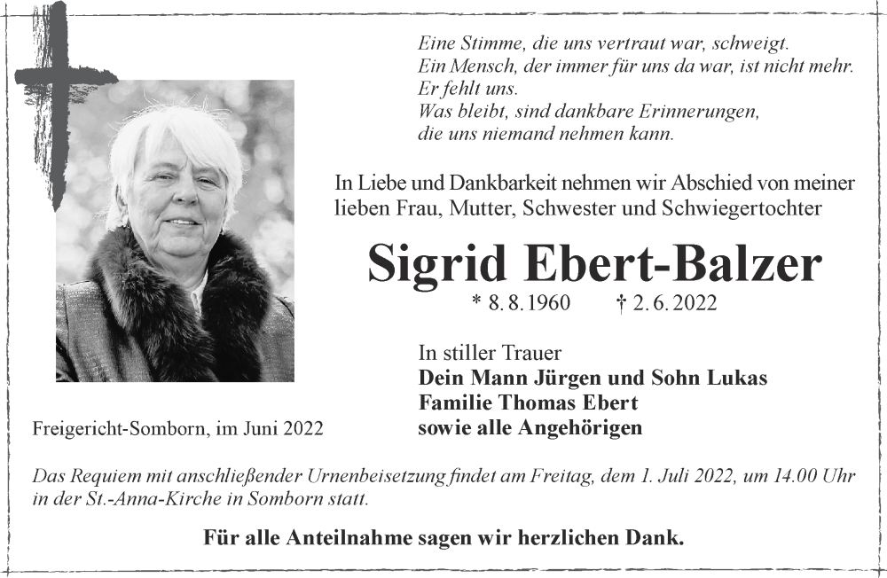 Hier finden Sie alle Traueranzeigen aus der Zeitung, die bisher für Sigrid Ebert-Balzer erschienen sind. Weitere Traueranzeigen, die in der Zeitung erscheinen, werden hier ebenfalls aufgelistet